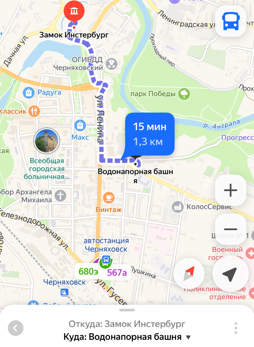 Водонапорная башня, построенная в 1898 году в самой высокой части Инстербурга, во время ВОВ уцелела, частично были утрачены только зубцы сверху.