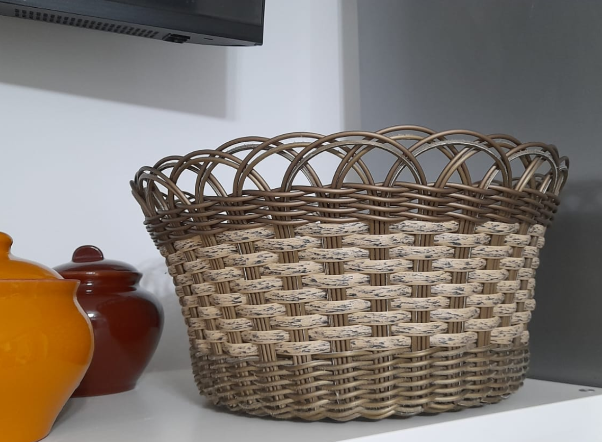 У меня редко бывает, чтобы очередная поплетушка понравилась с первого взгляда. Обычно я как бы привыкаю к своим работам, постепенно смиряясь с какими-то косяками и начиная оценивать изделие в целом. Но сегодня как раз такой случай, и исключение из правил - вот эта фруктовница. Конечно, если докопаться, в ней тоже немало изъянов: что-то где-то кривовато, где-то загибку можно сделать поровнее, где-то фальш-стойки подлиннее, но она мне нравится даже с такими косячками. Родилась на свет эта фруктовница совершенно случайно, потому как по плану у меня должна быть корзинка с ручками из серии "точь-в-точь". Нашла я ее у Кати Мурашовой и загорелась - хочу! Можно было, конечно, просто купить МК, благо он недорогой, всего 300 рублей. Но я решила, что это сделать всегда успею, а вот поломать голову, самой додуматься-догадаться, как сплетено изделие - для меня это просто кайф. Кайфовала недолго, хотя начиналось все хорошо. Я включила концерт Олега Митяева, чтобы нескучно было, Фенька составила