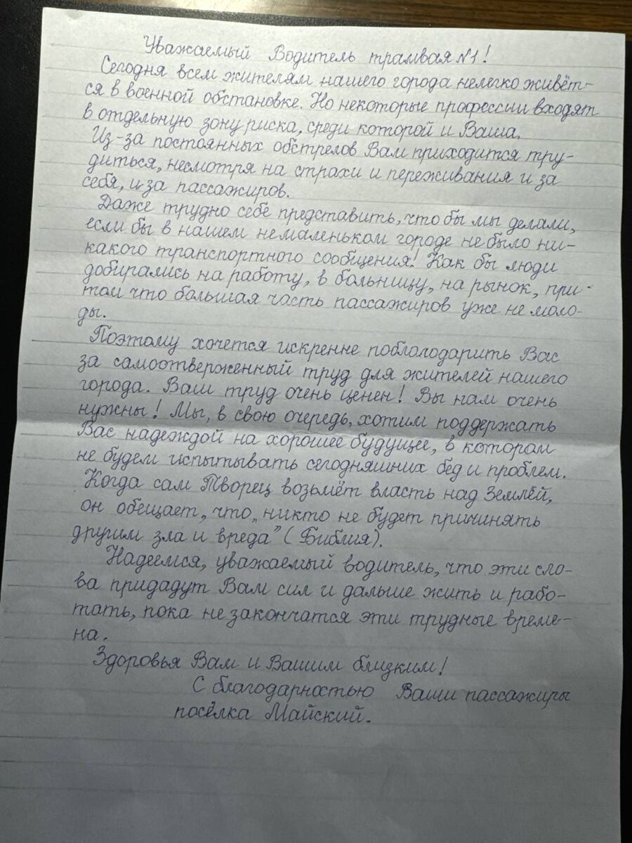 «Ваш труд очень ценен! Вы нам очень нужны!»: горловчане написали благодарственное письмо водителю трамвая