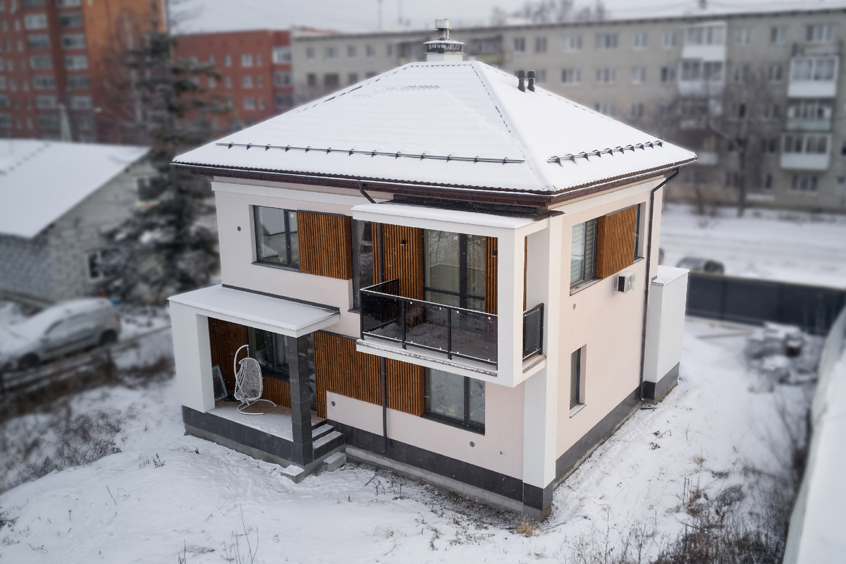 Отличный, компактный по пятну застройки и просторный внутри дом, выполнен по проекту с необходимыми нашим заказчикам изменениями планировки. Фундамент — ростверк по буронабивным сваям. Ростверк имеет особую форму, защищающую конструкцию утепления и отделки цоколя от пучения грунта, что серьезно увеличивает срок службы и позволяет сохранить начальные характеристики утепления цоколя на долгие годы. Перекрытия пола и потолка первого этажа железобетонные, а чердачное из дерева. Такая конструкция перекрытий позволяет добиться необходимой надежности и одновременно обеспечить отличный микроклимат в доме. Ограждающие стены выполнены из газоблока, а внутренние стены и перегородки из кирпича. Кирпичные стены и перегородки позволяют улучшить такие потребительские свойства, как шумоизоляция, устойчивость к динамическим нагрузкам (открывание и закрывание дверей, ударные нагрузки) и конечно общую надежность и жесткость конструкции стен. Стены дома утеплены базальтовым волокном Rockwool, толщиной 150