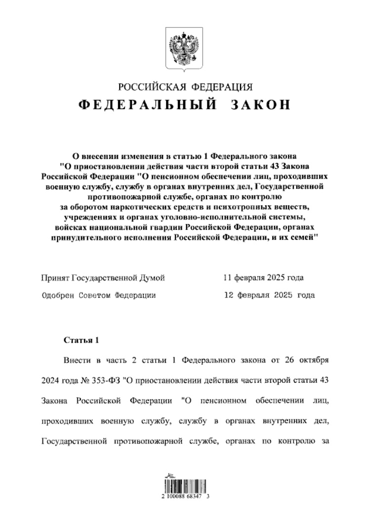 13 февраля 2025 года в Президентом РФ подписан закон, согласно которому понижающий коэффициент для расчета военных пенсий будет увеличен с 89,83% до 93,59%.