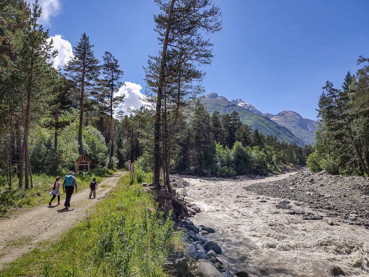 Первые два дня с погодой нам не очень везло, а сегодня низкие облака рассеялись и, вылезая из палатки, я даже смог рассмотреть вот такую большую расщелину, Волчьи ворота: А после завтрака на радость мою выглянуло солнце. Очень, надо сказать, ядреное. Нужно пользоваться кремом, чтобы не обгореть. Днем в Терсколе тихо. Группы туристов и альпинистов с утра уходят покорять местные тропы, поэтому в самом поселке мало кого остается. По дороге тренируются велосипедисты. На велосипеде тут роскошно- дорога отличная, а вниз ехать можно, пожалуй, километрами вообще не крутить педали. Про подъем в обратную сторону скромно умолчим) Бросается в Терсколе общая неухоженность. Такое прекрасное место, но всё выглядит, словно могучий Советский Союз рухнул только пять лет назад: Мост через Баксан в сторону "Поляны Чегет". Мы там гуляли вчера, когда совершали подъем на гору. Вдоль Баксана идет довольно хорошая экотропа. "Поляна Нарзанов- Поляна Чегет". Оборудованы туалеты, беседки, скамейки. Гулять по ней