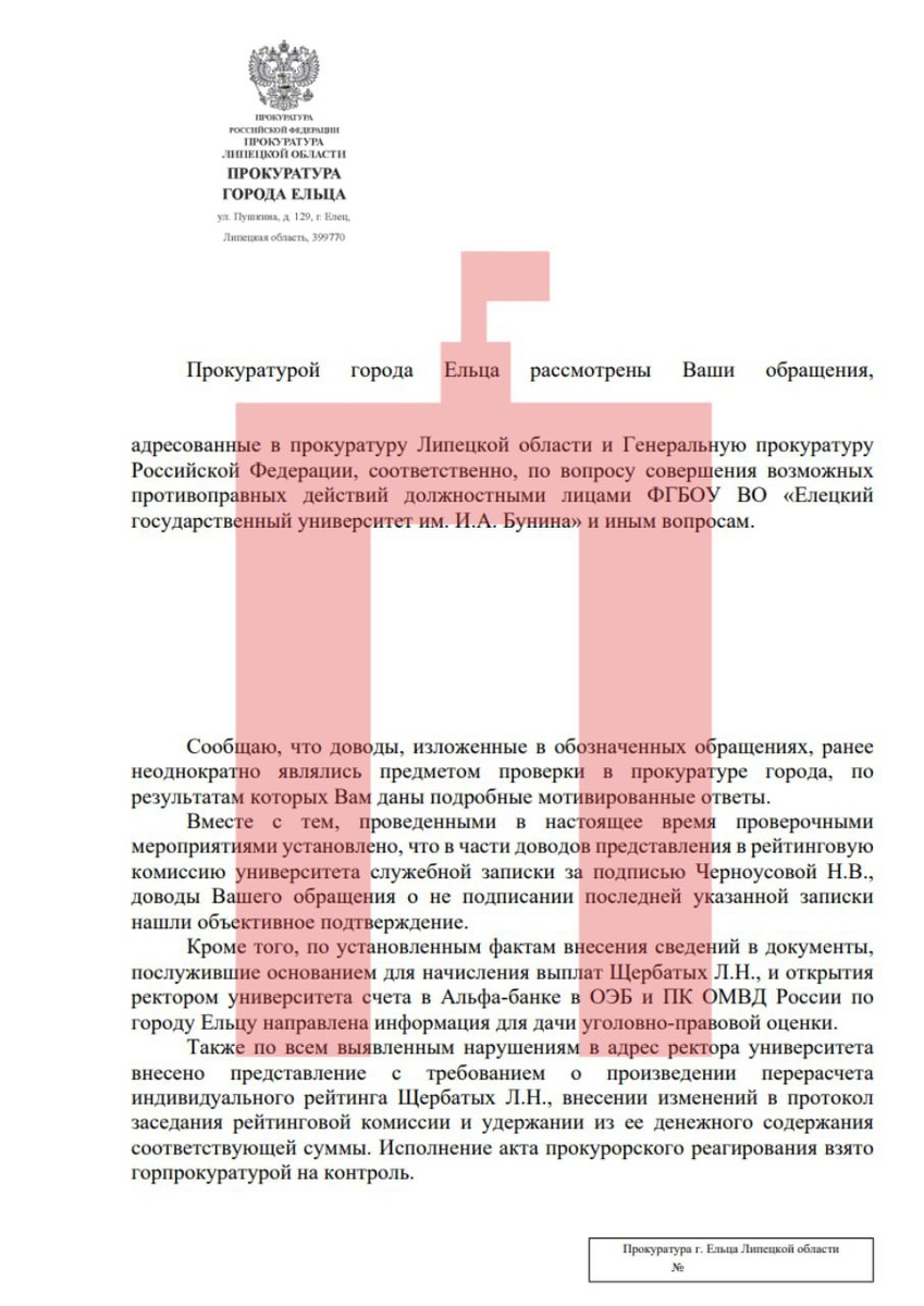 Прокуратура города Ельца направила представление в адрес ректора Елецкого государственного университета им. И.А. Бунина Сергея Щербатых. Ведомство выявило нарушения в действиях руководящего состава вуза. В частности, они касаются назначения завышенных, стимулирующих премий сотруднице кафедры восточных и европейских языков Людмилы Щербатых, которая является женой ректора.
