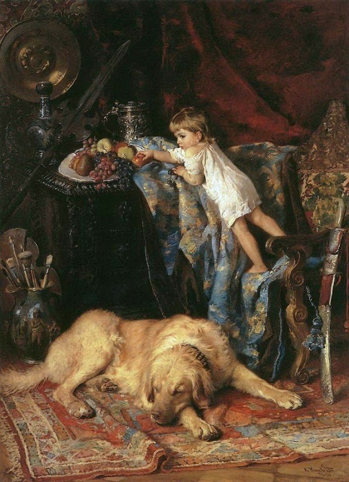 В Третьяковской галереи есть одна необычная картина, она называется «В мастерской художника», ее написал Константин Маковский в 1881 год. На ней изображен маленький мальчик в белой сорочке, который влез на стул и схватил аппетитное красное яблоко, лежащее на блюде. А на полу растянулась крупная палевая собака. Не многие люди задерживаются у этого полотна, я же каждый раз подолгу его рассматриваю. Моё внимание приковывает собака! Это необычный пес. Большой, но не тяжелый, мощные лапы, толстый хвост, солидная башка с чуть вытянутой мордой и бархатными висячими ушами. Он кажется спящим, но я не сомневаюсь, что он все слышит и точно знает, что происходит вокруг. Когда я говорил вам, что это необычная картина, то я не грешил против истины. Все дело в том, что там запечатлён представитель породы, которую нынче уже не встретишь. Наши предки называли их МОРДАШАМИ. В европейских справочниках именовали МЕДЕЛЯНАМИ или русскими мастиффами. Сейчас о них мало кто помнит. Собака, сбивавшая с ног быка