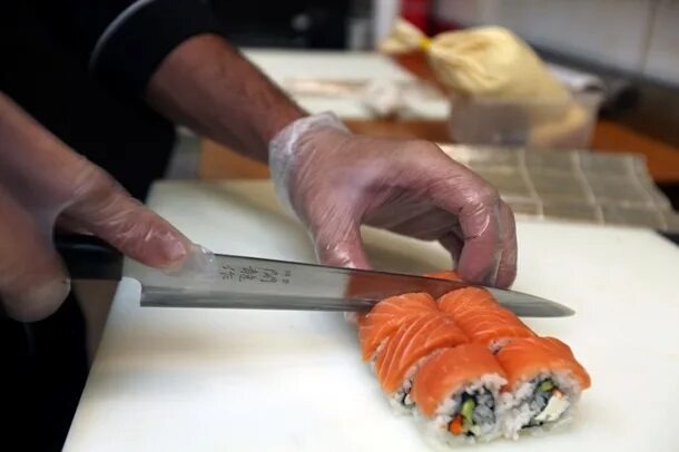 - После каждой нарезки ролла чистить нож влажной тряпкой, чтобы избежать склеивания риса и улучшить точность резки.