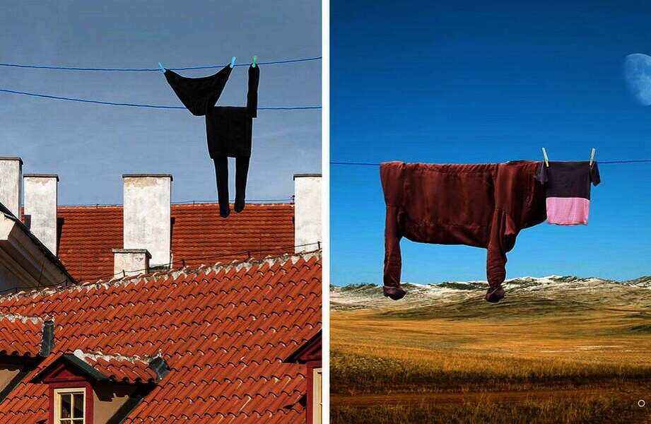 Когда стирка становится чем-то большим: художница создаёт удивительных животных, пока сушит одежду. Животные — это всегда прекрасно! С этим утверждением согласна художница Хельга Штенцель, которая живёт в Лондоне и уже несколько лет занимается созданием изображений животных. Однако она выбрала для своего творчества весьма оригинальный подход: она превращает привычные предметы в медведей, коров, панд и лошадей. Для создания своих произведений Хельга использует обычную бельевую верёвку, но не совсем обычным образом: её звери «сушатся» над городами, в пустыне, на фоне моря и среди сугробов. Первое животное Хельга создала случайно. Она заметила, что брюки её сына, висящие на верёвке, напоминают голову лошади. Тогда она добавила ещё несколько вещей, чтобы получилось целое животное, и сфотографировала его.