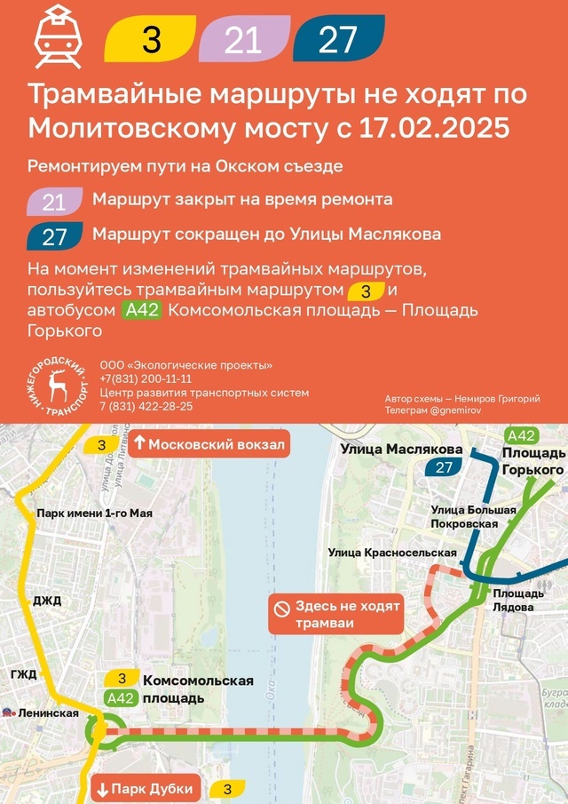 Из-за этого трамвай №21 будет временно отменён, а №27 перестанет ходить в нижнюю часть города. Появилась схема движения общественного транспорта в Нижнем Новгороде на время модернизации трамвайных путей на Окском съезде. Она опубликована на странице ЦРТС. Работы, которые стартуют 17 февраля, предусматривают полную замену рельсов на участке от улицы Красносельской до Молитовского моста, не затрагивая саму переправу. Фото: Новая маршрутная сеть Нижегородской агломерации Напомним, до осени площадь Горького и Комсомольскую площадь свяжет новый временный маршрут автобуса А-42. Трамвай №27 временно не будет ходить в нижнюю часть города: вагоны будут курсировать от депо №1 по улице Надежды Сусловой до разворотного кольца на улице Маслякова. Маршрут трамвая №21 временно отменят, все вагоны перенаправят на №3, который соединяет парк «Дубки» и Московский вокзал. Согласно информации из телеграм-канала «ProСтратегию», после модернизации трамвайной инфраструктуры в 1,5 раза возрастет средняя скорос