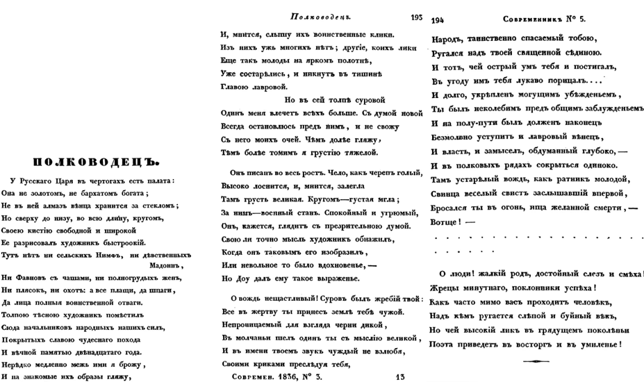 В сентябре 1836 вышел 3-ий том журнала А. С. Пушкина "Современник", где среди прочего было опубликовано пронзительное стихотворение "Полководец".
