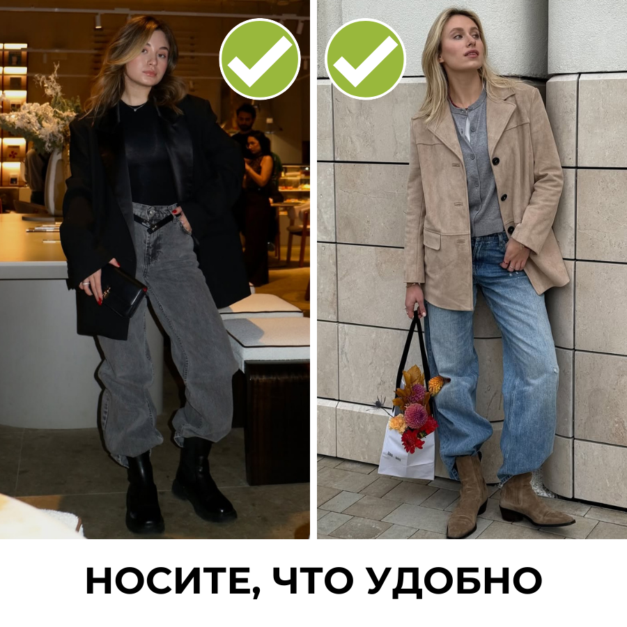 Наткнулась на новую модную фишку, которую теперь часто использую, — заправляю свободные джинсы в полусапожки или казаки. Для весны — самое то. Расслабленно, стильно и тепло.