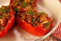 Измельчаем свежую зелень. Перцы разрезаем пополам и очищаем от семян. Плодоножки оставляем. Обжариваем лук на сковороде с растительным маслом в течение 5-7 минут, до поджаристости. Добавляем к луку грибы и обжариваем ещё 3-5 минут, до мягкости. Следом выкладываем в сковороду кабачки и баклажаны и обжариваем 5 минут. Добавляем помидоры.