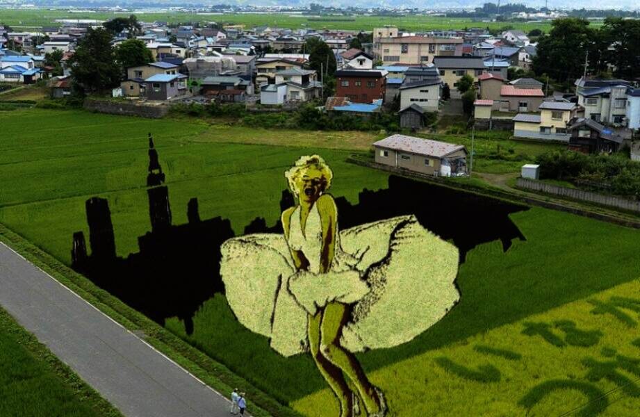 Инакадате — это небольшая деревушка в Японии, расположенная в префектуре Аомори. В ней проживает менее девяти тысяч человек. Несмотря на свои скромные размеры, Инакадате известна во всём мире своими рисовыми полями. Если рисовые террасы можно встретить по всей Азии, то такие поля, как в Инакадате, больше нигде не найти. Местные жители превращают их в настоящие произведения искусства каждый сезон. На этих полях в разное время появлялись персонажи «Звёздных войн», герои аниме, Мона Лиза и Мэрилин Монро. В 1993 году на полях рядом с этой деревушкой появилась первая картина. С тех пор изображения на полях стали её символом, привлекая множество туристов. Идея создания картин на полях принадлежит местному учителю Ацуши Ямамото. Сначала он работает с компьютером, создавая эскизы будущих работ и подбирая цветовую гамму. Затем, следуя разработанному плану, начинается процесс посадки риса. Обычно на исходном изображении тысячи оттенков, но Ямамото необходимо работать с ограниченной палитрой. Для