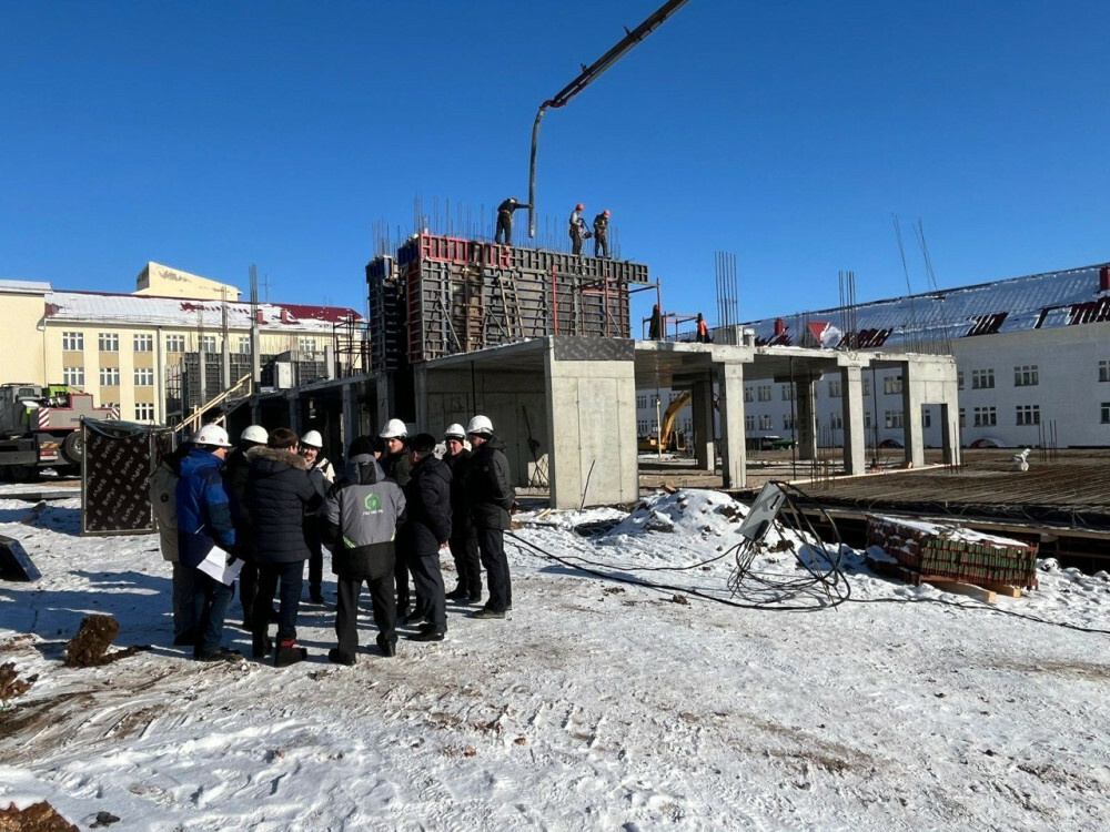 Рабочая поездка началась с посещения строительной площадки общеобразовательной школы на 640 ученических мест, совмещенной с детским садом на 160 мест в микрорайоне «Восточный-1». Объект возводится в рамках нацпроекта «Демография», который в этом году продолжит работу под другим названием – нацпроект «Семья».