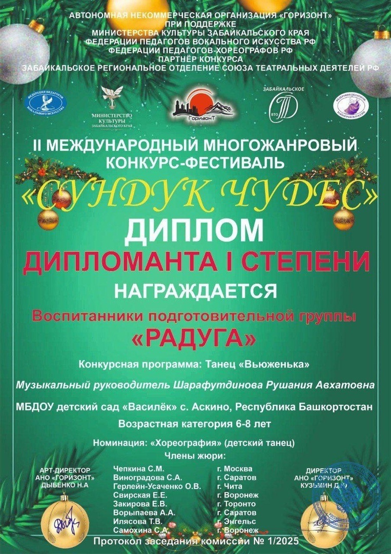 Конкурс творческих работ на темы «Новый год» и «Рождество» проходил с 13 по 24 января. По итогам, подведенным 1 февраля, воспитанники подготовительной группы «Радуга» стали дипломантами I степени в номинации «Хореография», а их руководитель Рушания Авхатовна удостоена Благодарственного письма за высокий вклад в развитие детского творчества.