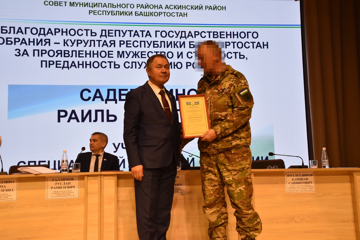Так, Кашшаф Ямалетдинов вручил Благодарность депутата Государственного Собрания – Курултая Республики Башкортостан участнику специальной военной операции из с. Кигазы за проявленные мужество, стойкость и преданность служению Родине. Также в благодарность депутат вручил бойцу путевку в санаторий «Танып».