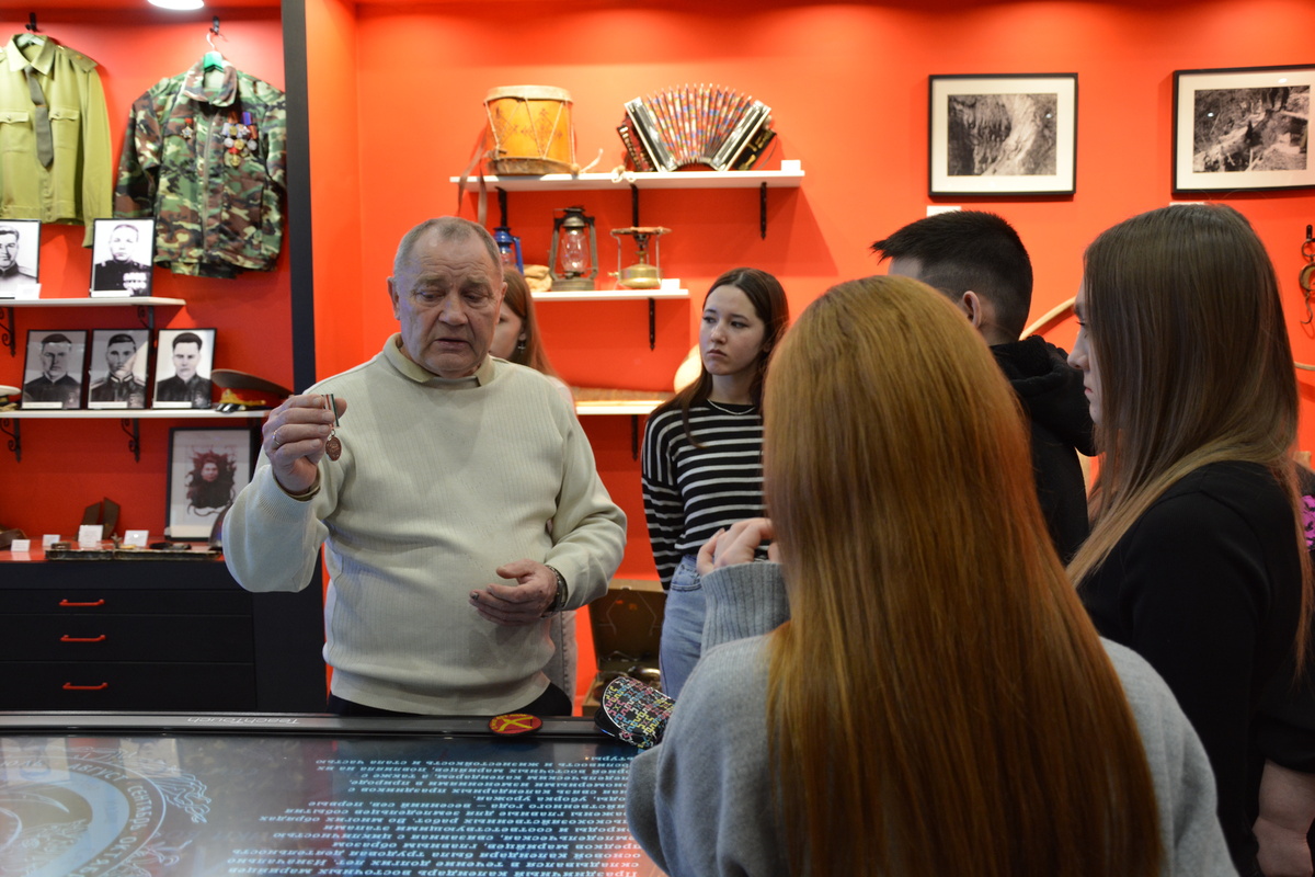 На этот раз участниками патриотической беседы стали студенты Мишкинского агропромышленного колледжа. Ильяс Раилович познакомил их с книгой «Закаленные Афганистаном», на страницах которой биографии земляков-уроженцев Мишкинского района, принимавших участие в десятилетней войне. Кадры кинохроники, созданной ведущим методистом по кино Александром Крутовым, никого не оставили равнодушным – фильм про «афганцев» полностью передает атмосферу того трагического и героического времени. Разговор плавно перешел к истории Великой Отечественной войны. Студенты внимательно слушали о подвигах Героев Советского Союза, с интересом рассматривали экспонаты музея. Особое внимание ребят привлекла коллекция боевых реликвий: пули и патроны, хранящие в себе многолетнюю историю страшных последствий войны. Будучи фотографом, методист музея считает своим долгом сохранить память о погибших участниках СВО. Ильяс Раилович собирает материал о бойцах и планирует объединить их в один единый фильм. Он поделился, что сов