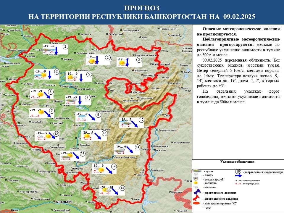 Опасные метеорологические явления не прогнозируются. Неблагоприятные метеорологические явления прогнозируются: на отдельных участках дорог туман с видимостью 500 м и менее. 09.02.2025 переменная облачность. Без существенных осадков, местами туман. Ветер северный 5-10м/с, местами порывы до 14м/с. Температура воздуха ночью -9,-14°, местами до -19°, днем -2,-7°, в горных районах до +3°.