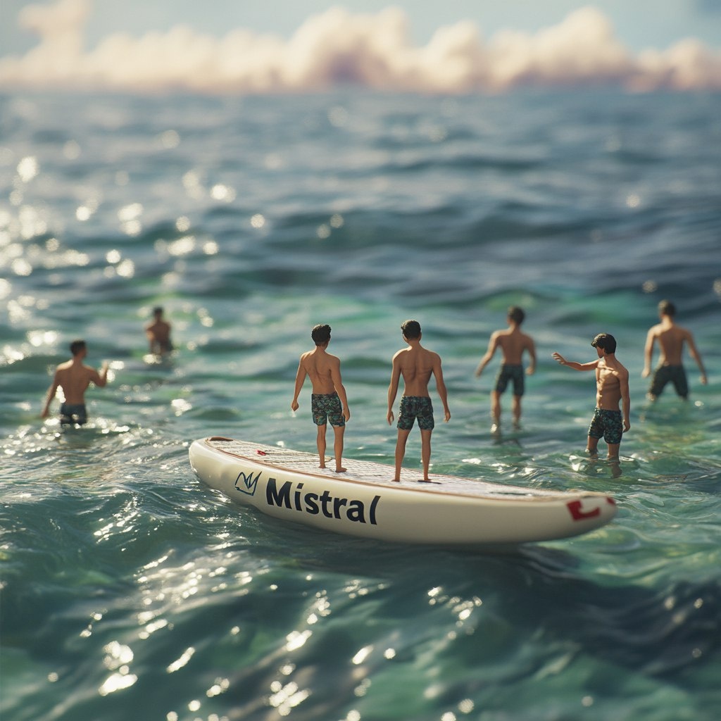 Промт для нашего изображения: a hyper-realistic scene featuring [six] tiny [young men with a big muscles], no larger than a bottle cap, working on a massive [vast sea with a bright horizon]. The [six young men with a big muscles] dressed in [a swimming shorts], is intensely focused, [they all] interacting with [one] oversized [SUP with logo "Mistral"] Те слова, которые указаны в скобках, можно и нужно менять в зависимости от желаемого результата. 12. Получаем 4