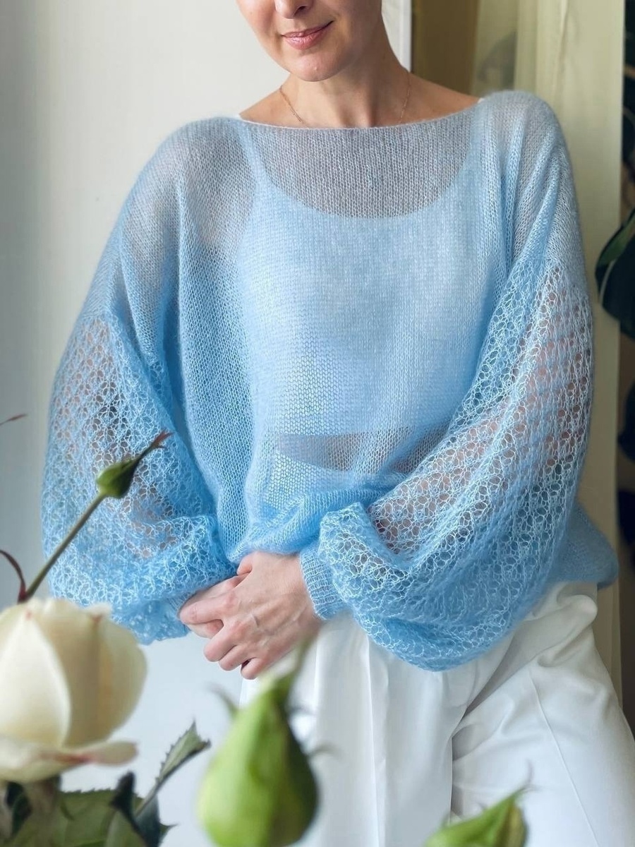 Небесно-голубой пуловер-паутинка с ажурными рукавами от Оксаны Гречиной ♥