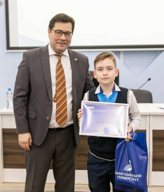 Ученик 7 б класса школы деревни Константиновка Артём Сафин был награждён Благодарственным письмом за активное участие и достижение высоких результатов в научно- исследовательской деятельности.