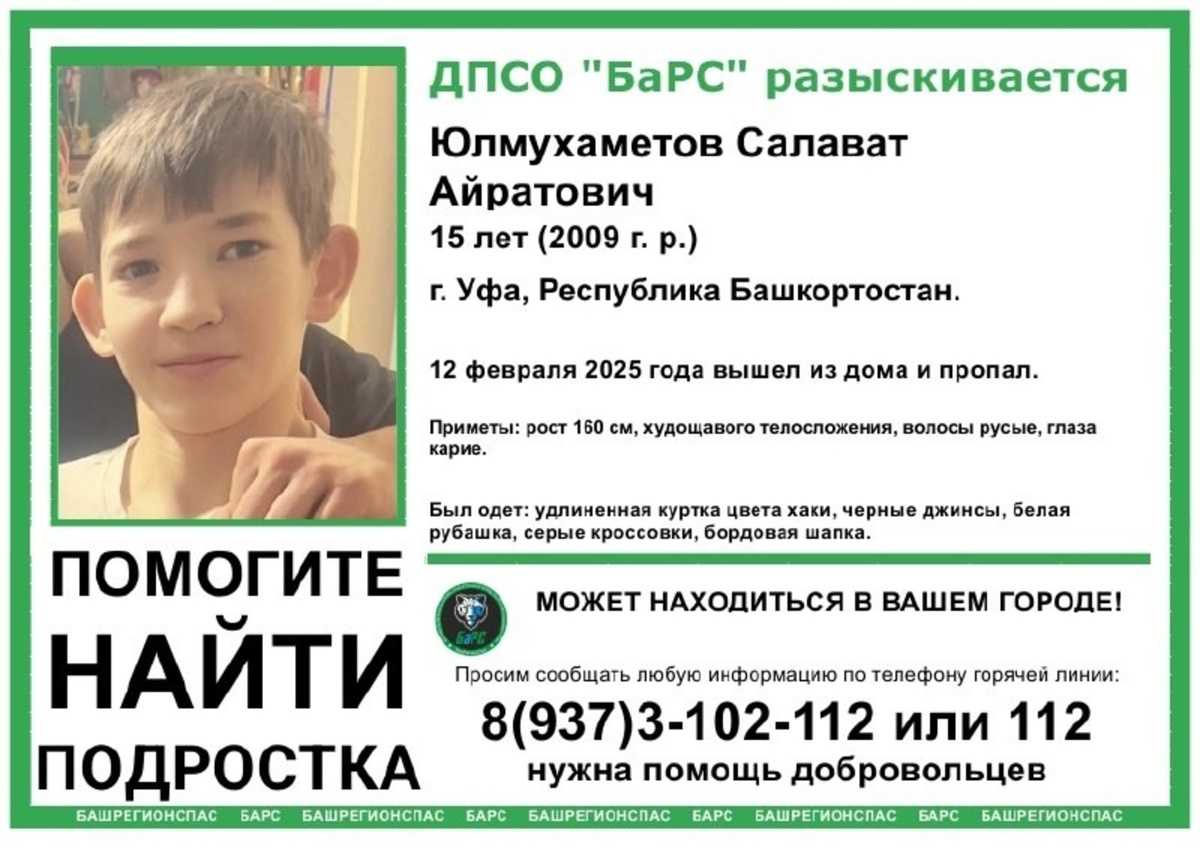 По данным волонтёров, подросток ушел из дома 12 февраля и пропал. До сих пор о его местонахождении ничего не известно. Фото:группа «ДПСО „БаРС“ (БашРегионСпас)», Vk. Источник: группа «ДПСО „БаРС“ (БашРегионСпас)», Vk. Требуется помощь добровольцев.