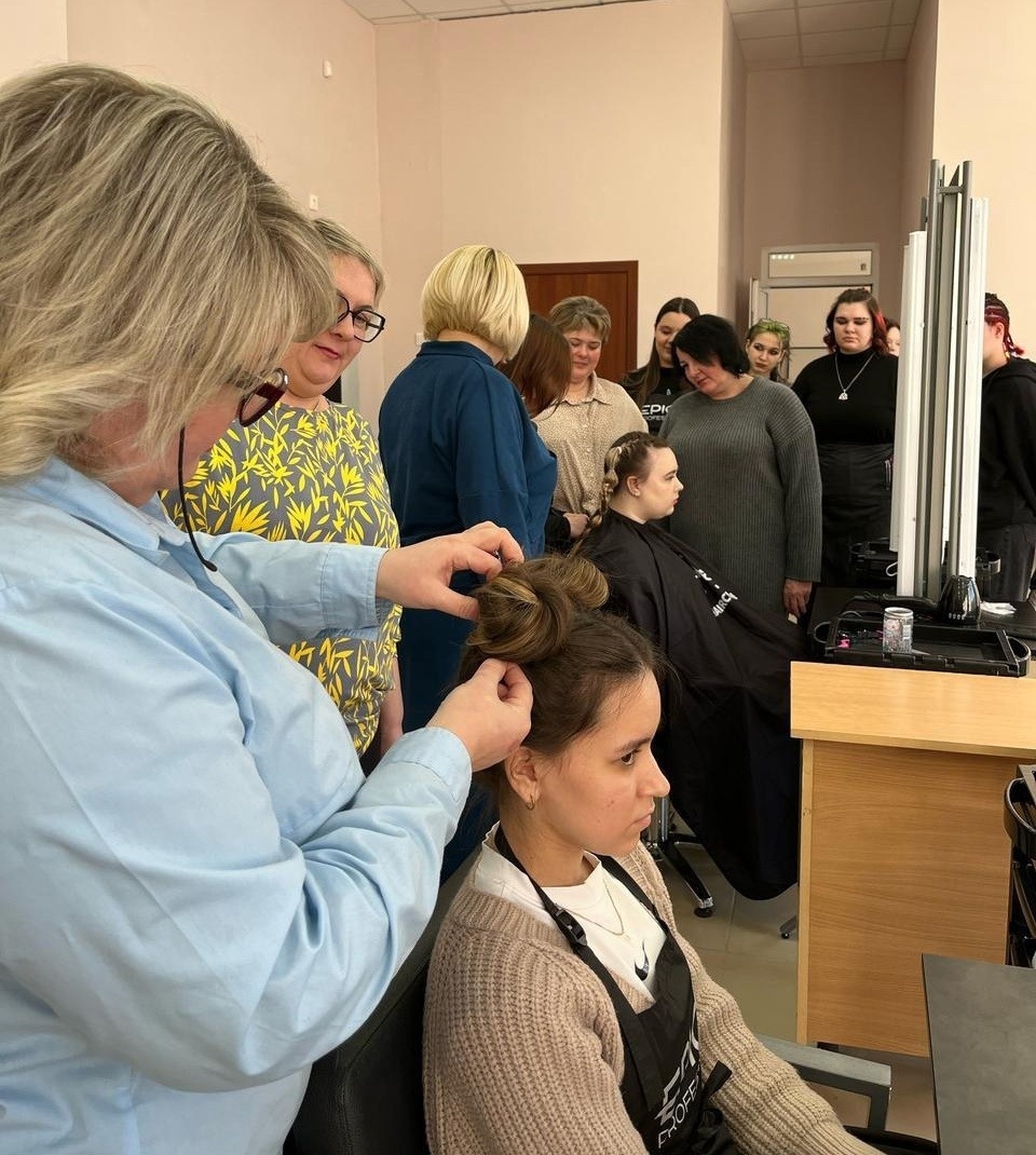 Преподаватель спецдисциплин Марина Гильфанова и студенты выпускной группы по профессии «парикмахер» показали родственникам бойцов, как плести необычные косы. Участники мастер-класса не только наблюдали за работой парикмахеров, но и сами попробовали сделать интересные причёски. Фото ОМПК Автор: Анастасия Аверина
