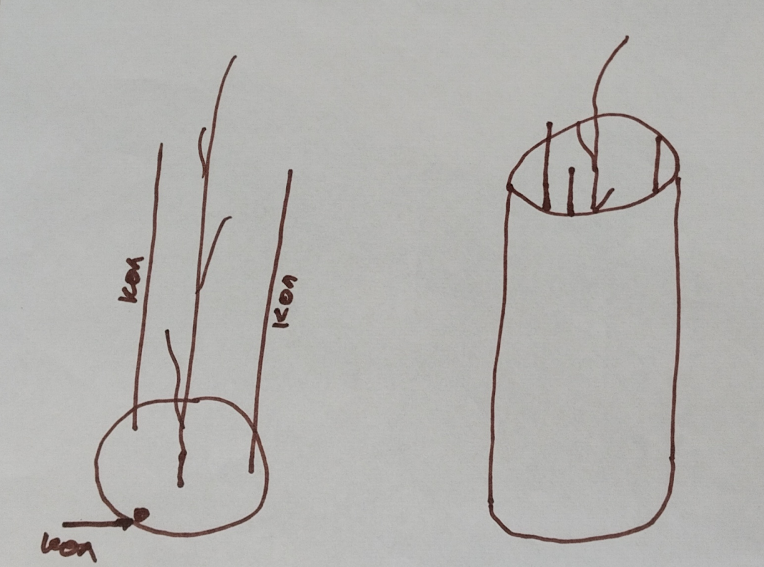 После посадки саженца вбиваем два кола так, как показано на рисунке. Надеваем на саженец с колами мешок (рукав). Затем вставляем третий кол в рукав. Отводим его так, чтобы мешок был растянут между колами. И забиваем