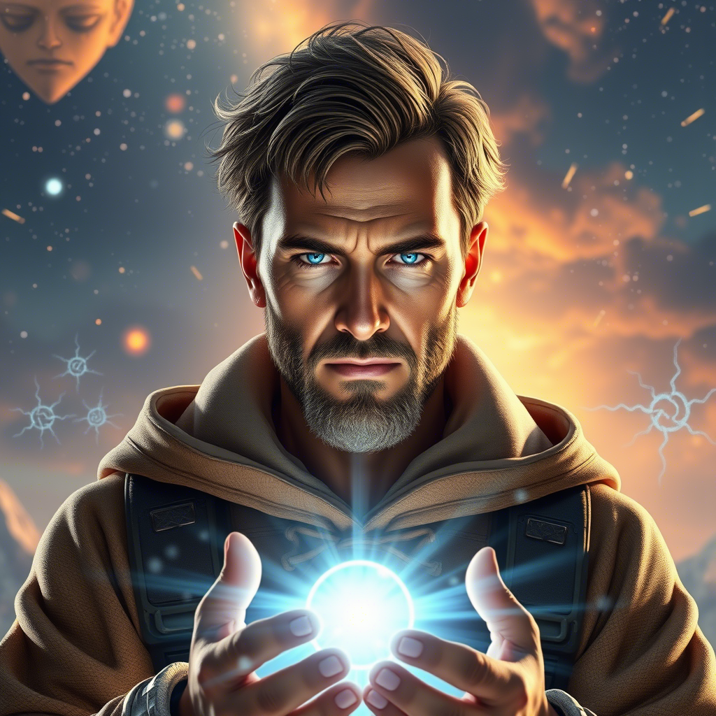 В центре космической кузницы, с сияющими потоками в ладонях рук, стоял кузнец-волшебник. Его движения были точными и полными вдохновения ✨, словно каждая частичка света в его руках создавал новую галактику. Он работал не устало, формируя планеты, звезды и целые системы, прямо из раскаленной материи 🌌. Некоторые из его творений были похожи на лица людей — их контуры проступали среди светящихся облаков, а вспышки энергии создавали выражения эмоций на этих космических "лицах". Одна планета могла улыбаться 🌍, другая — задумчиво смотреть вдаль 🌟, а некоторые звезды даже источали слезы света, словно выражая печаль 💫. Его руки двигались в причудливом танце 🔥, смешивая элементы вселенной: огонь, металл и энергию. Воздух вокруг наполнился красивой мелодией будто сама Вселенная пела ему песню благодарности 🎶. Каждый новый мир, который он создавал, был уникален и наполнен секретами. Некоторые планеты источали нежное тепло ☀️, другие были холодными и загадочными ❄️, но все они были пропита
