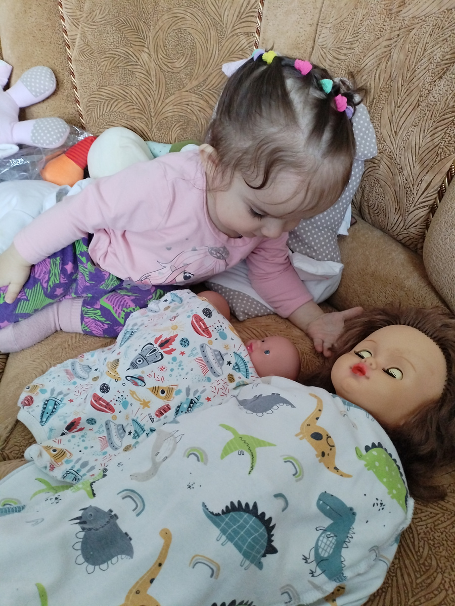 Сева тоже подтянулся. Укрывать и целовать и ему понравилось. А сегодня Амелия принесла мне пупсов и распашонки. И показывает, одевай их. Пупсы маленькие. Их только запеленать получилось. Все равно Амельке понравилось. Радовалась, играла.