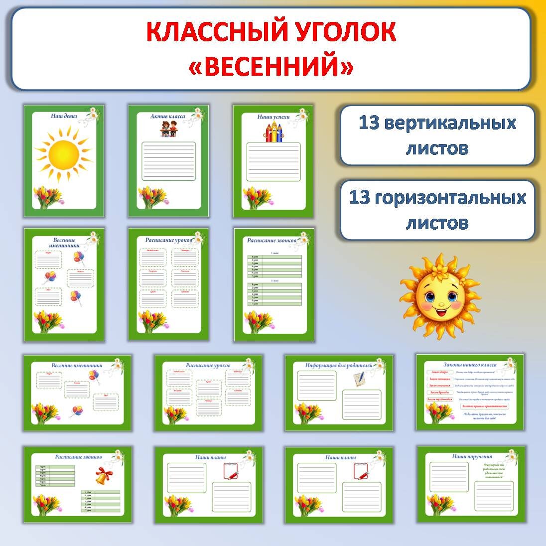 Данная разработка содержит листы для оформления классного уголка в весенней тематике. В данной разработке13 вертикальных листов и 13 аналогичных горизонтальных листов, чтобы у Вас не было проблем с ориентацией листа на стенде.