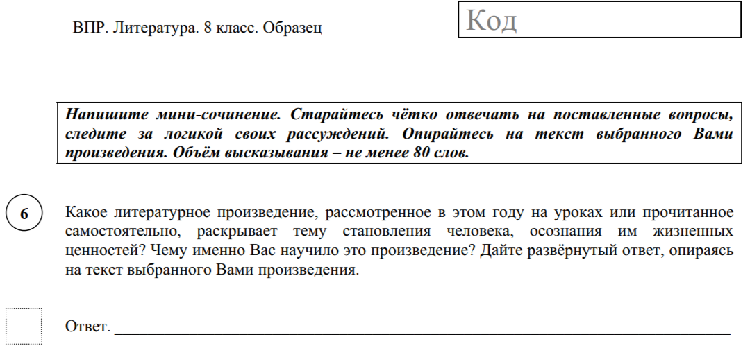 В задании №6 ВПР по литературе предлагается написать мини-сочинение, которое представляет собой ответы на поставленные вопросы. Ниже предложен шаблон для написания сочинения. Он включает в себя тезис, пример из литературного источника, развёрнутый ответ на вопрос, вывод. Введение не является обязательной частью сочинения, главное – это наличие тезиса. Объём сочинения – не менее 80 слов. Становление человека – это многогранный процесс, который начинается с рождения и продолжается всю жизнь. Я думаю, что жизненные ценности во время формирования личности приобретаются по мере накопления опыта. Рассуждая на тему становления человека, я вспоминаю произведение Александра Сергеевича Пушкина «Капитанская дочка». Думаю, повесть раскрывает данную тему достаточно глубоко. Один из главных героев этой повести, молодой дворянин Пётр Гринёв, научил меня тому, как можно в любых обстоятельствах оставаться верным своим принципам человеком. Изначально он казался легкомысленным, но в процессе развития со