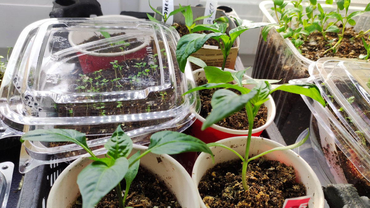 Итак, из съедобного в первую очередь - перцы. Я их сею рано, потому что не представляю, как эта культура может перерасти. Высаживаю под дуги с укрывным материалом разветвлённые пушистые кустики из литровых горшков, не меньше. А по-другому у меня никакого толка от них - одна волна плодов, а там уже и осень...