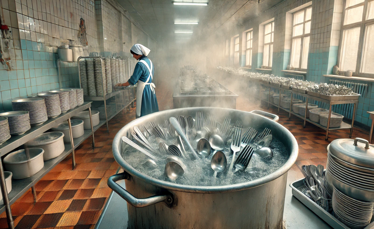 Официальная версия была проста: гигиена. Но на деле это было не просто мытьё, а целый процесс дезинфекции. В советских столовых поток людей был огромным, а посудомоечных машин не было. Технологии дезинфекции требовали обработки посуды при высокой температуре. Поэтому ложки, вилки и ножи после обычного мытья погружали в кипяток.