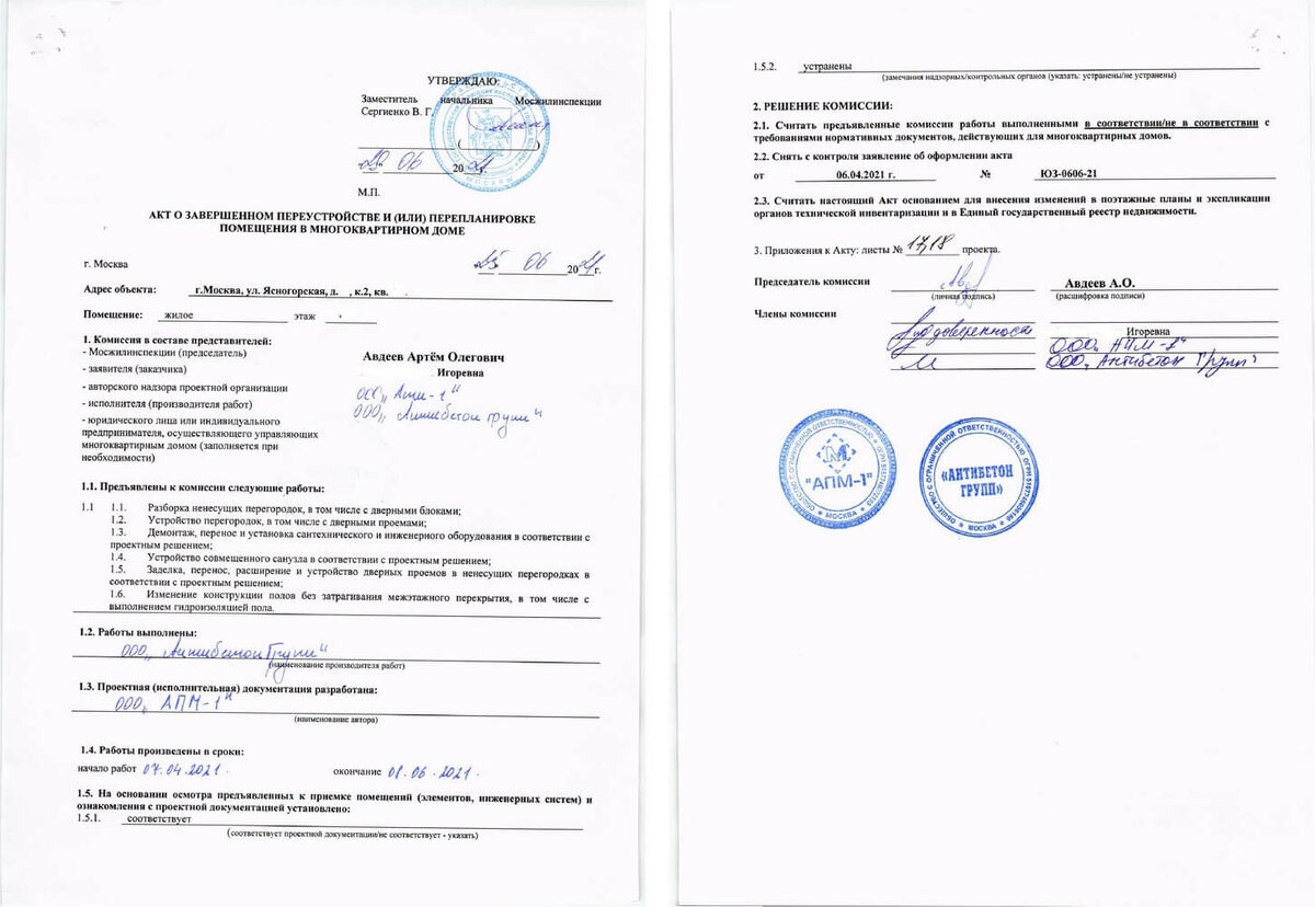- при согласовании перепланировки, то есть когда распоряжение получается до того, как начался ремонт. Сначала готовится проект перепланировки и техническое заключение. После выполнения перепланировки подписывается акт о завершенном переустройстве;