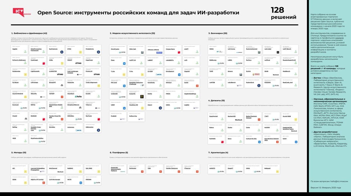 Новая аналитика ICT.Moscow посвящена российским Open Source-инструментам для разработки искусственного интеллекта, опубликованным за последние пять лет. Среди наиболее востребованных – библиотеки и фреймворки, позволяющие автоматизировать рутинные операции. Лидерами по числу разработок являются Москва и Санкт-Петербург, но активны и региональные команды. Аналитики ICT.Moscow изучили рынок инструментов Open Source для ИИ, которые выкладывались в открытый доступ с начала 2020 года по январь 2025 года. Самыми обширными по представленности инструментов стали библиотеки и фреймворки, далее следуют модели искусственного интеллекта, на третьем и четвертом местах - бенчмарки и датасеты соответственно. Пик публикаций пришелся на 2023 и 2024 годы, когда было представлено 68% от всех продуктов за пять лет. При этом за январь 2025 года уже опубликовано инструментов столько же, сколько и за весь 2020 год. Москва является абсолютным лидером по месту расположения издателей решений Open Source для ИИ