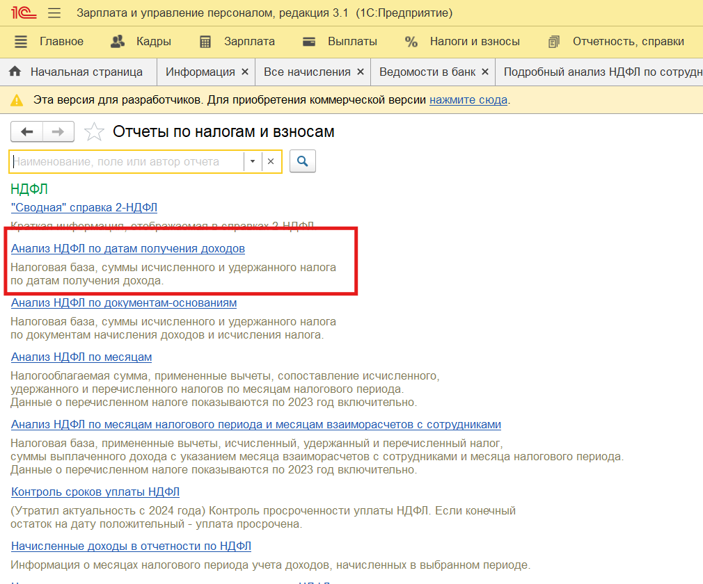 Как посмотреть распределние сумм НДФЛ в уведомление с помощью отчетов в 2025 г. в 1С ЗУП