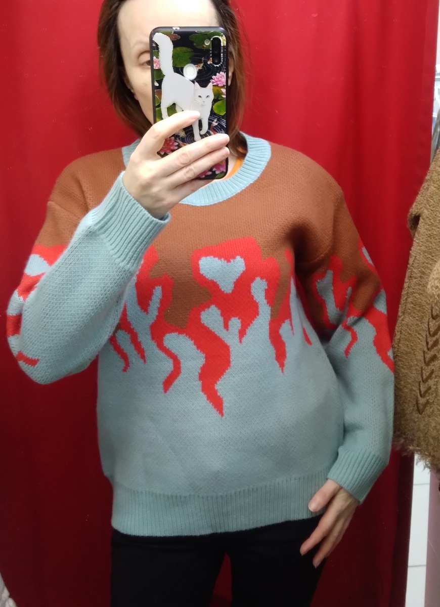 Джемпер с необычным рисунком и неизбитым сочетанием цветов.