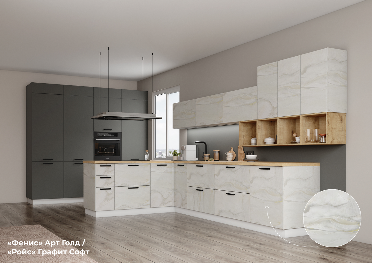 Как сделать дизайн кухни визуально дороже: тренд 2025. Сочетание фасадов Арт коллекции «Фенис».