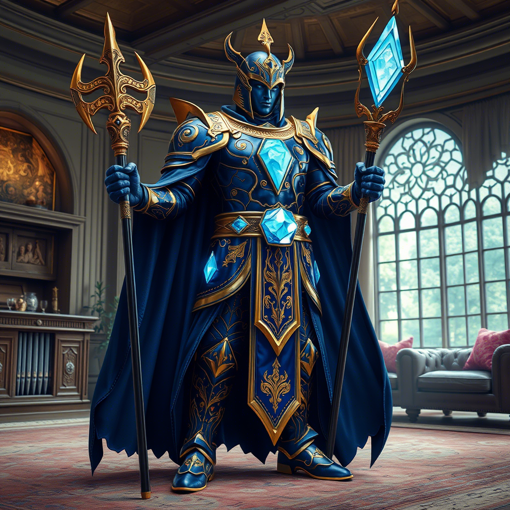 Космос стоял посреди обычной, простой комнаты, где каждый предмет seemed застывшим во времени. Его индиго броня немного светилась синим цветом 🌌, наполняя помещение теплом и создавая вокруг него ауру спокойствия. В воздухе витало ощущение необычности момента — казалось, сама реальность здесь была слегка искажена ✨.