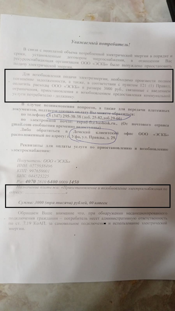 В Уфе "ЭСКБ" отключает потребителей электроэнергии за долг менее 2 месяцев Схема уловки довольная простая, но наглая. Многие потребители оплачивают за коммунальные услуги в течении последующего месяца. Главное, чтобы долг не превысил 2 месяцев, когда у ресурсников появляется право на отключение от сети. Однако... Ко мне обратилась жительница Уфы, которая иногда по забывчивости платила в промежутке от месяца до двух. И вот 10 февраля к ней пришел электрик из "Электросбыта" и ... отключил квартиру от электроэнергии. Хотя последний ее платеж был в декабре, а за январь должна была оплатить как раз до 10 числа! По моему субъективному мнению "Электросбыт" нарушил весь процесс отключения потребителя от коммунальной услуги 1. В соответствии с пунктом 1 статьи 155 Жилищного кодекса РФ и пунктом 81 Основных положений плата за коммунальную услугу (электроснабжение) вносится ежемесячно, до 10-го числа месяца, следующего за расчетным периодом. 2. В случае неполной оплаты потребителем коммунальной у