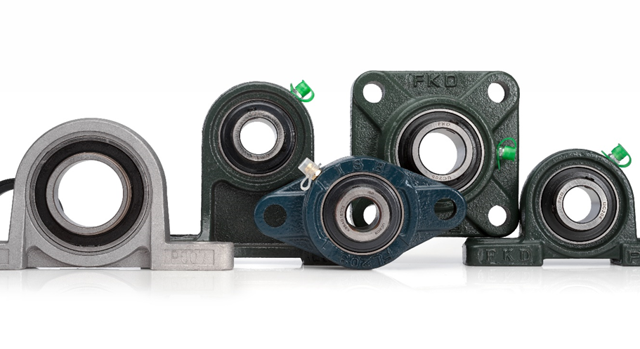 - Корпусные подшипники UCF. Фланцевые комплектующие в литом квадратном корпусе с удлиненным кольцом и крепежными отверстиями (4 шт.). Крепление на валу осуществляется посредством стопорных винтов. Поставляются со смазкой, которую при необходимости можно добавить. Пригодны для эксплуатации при средних и малых оборотах, нельзя использовать для работы в экстремальных условиях.