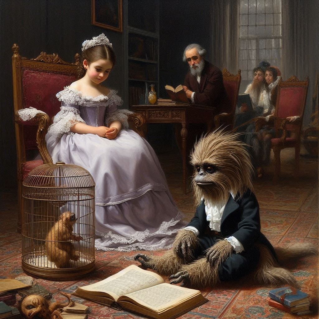 Наевшись до отвала, Питер уселся посреди клетки на песке и что-то рисовал. Он так увлекся своим занятием, что не заметил даже, как на лавочке короля появилась девочка в красивом белом платье, с бантиками и рюшками, с веселыми завитками на голове и ужасно расстроенным скучающим выражением на лице. Она даже не посмотрела на мартышку в клетке, молча открыла книгу, которую принесла с собой, и начала читать её вслух: