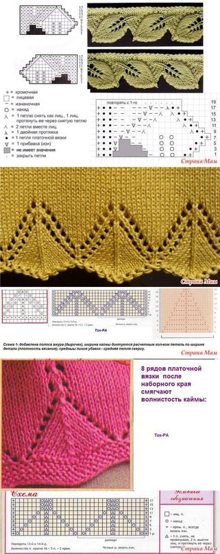 Доброго вечера! В продолжении предыдущей статьи о вязаных бордюрах просто необходимо упомянуть и об узорчатой кайме. Оба термина переплетаются между собой, не образуя существенного различия. Кайма скорей всего служит украшением самой кромки изделия, делая изгибы в процессе вязания самого узора. Бордюр же образует собой полотно, отличающееся от основного узора по более сложному рисунку. Взгляните как можно украсить края своего вязаного шедевра. Возьмите себе на заметку, когда-нибудь да пригодится. Формируйте свои архивы копированием всяческих полезностей. Это намного легче и проще, нежели заниматься долгим перелистыванием страниц на сайтах. Желаю вам побольше полезных статей, потрясающих идей и увлекательных проектов! Смотрите и другие полезные подборки, там много интересного.