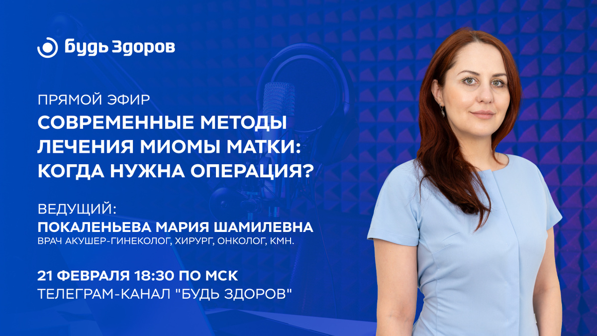 📌 Тема: Современные методы лечения миомы матки: когда нужна операция? 📌 Когда: 21 февраля (пт) в 18:30 (мск) 📌 Где: Telegram-канал клиники "Будь Здоров" 📌 Ведущий: Покаленьева Мария Шамилевна — врач акушер-гинеколог клиники на Сретенке и Рязанском проспекте, хирург, онколог, КМН. Миому матки выявляют у 30–35% женщин репродуктивного возраста. Однако, учитывая бессимптомное течение в ряде случаев, истинная распространённость может достигать 70%. Средний возраст диагностики составляет 32–34 года, но заболевание может развиваться и в более молодом возрасте. Что обсудим во время эфира: ✅ В чем сущность этого заболевания? ✅ Какие есть разновидности миомы? ✅ Какие причины и факторы риска развития? ✅ Как ее диагностировать, и всегда ли требуется лечение? ✅ Какие самые передоавые технологии лечения мы используем в "Будь Здоров". Задавайте ваши вопросы в комментариях! Доктор обязательно ответит на все вопросы после проведения основной части эфира!
