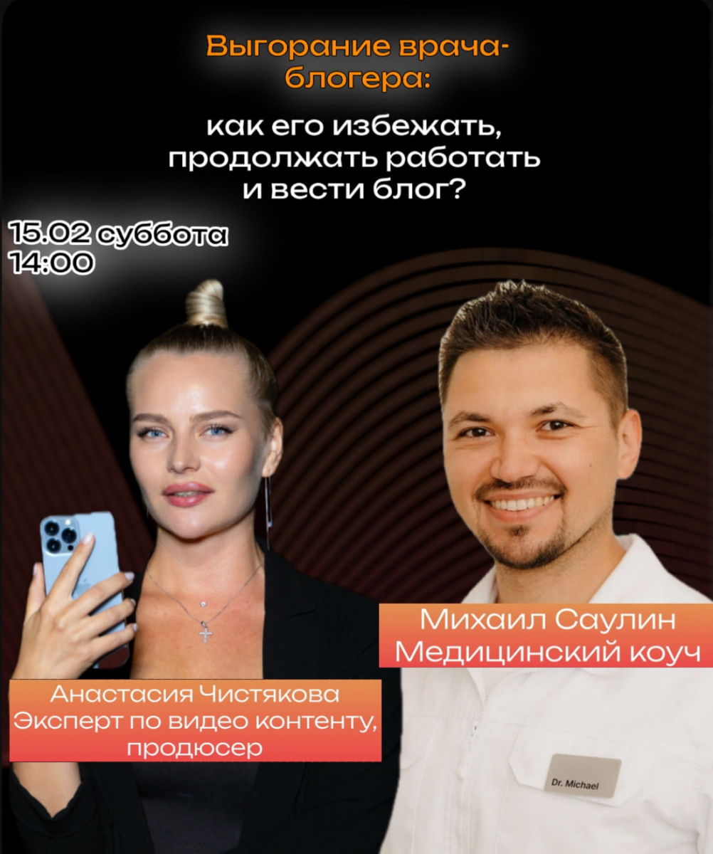 На этой неделе много говорю про выгорание — потому что это очень частая проблема у врачей всех специальностей, которые помимо основной своей работы начинают вести блог. Поэтому подготовила для вас кое-что очень полезное — в эту субботу я пригласила медицинского коуча, стоматолога, кандидата медицинских наук Михаила Саулина провести со мной вместе прямой эфир на тему «Как избежать выгорания эксперту, который ведет свой блог? » ➖ Что мы обсудим? ✔️Как создать базу пациентов и стать независимым специалистом ✔️Первые признаки выгорания ✔️Эффективные стратегии для предотвращения выгорания. ✔️Негативный опыт прошлого, как его не повторить ✔️Как пережить хейт? ✔️Кому блог точно не нужен? ❗️Дата: 15 февраля, в 14:00 Почему важно быть на эфире Выгорание может затруднить вашу работу и снизить качество жизни. На эфире мы поделимся практическими советами, как сохранить мотивацию и вдохновение, а также обсудим, как и какие задачи можно делегировать, чтобы освободить время для творчества и разв