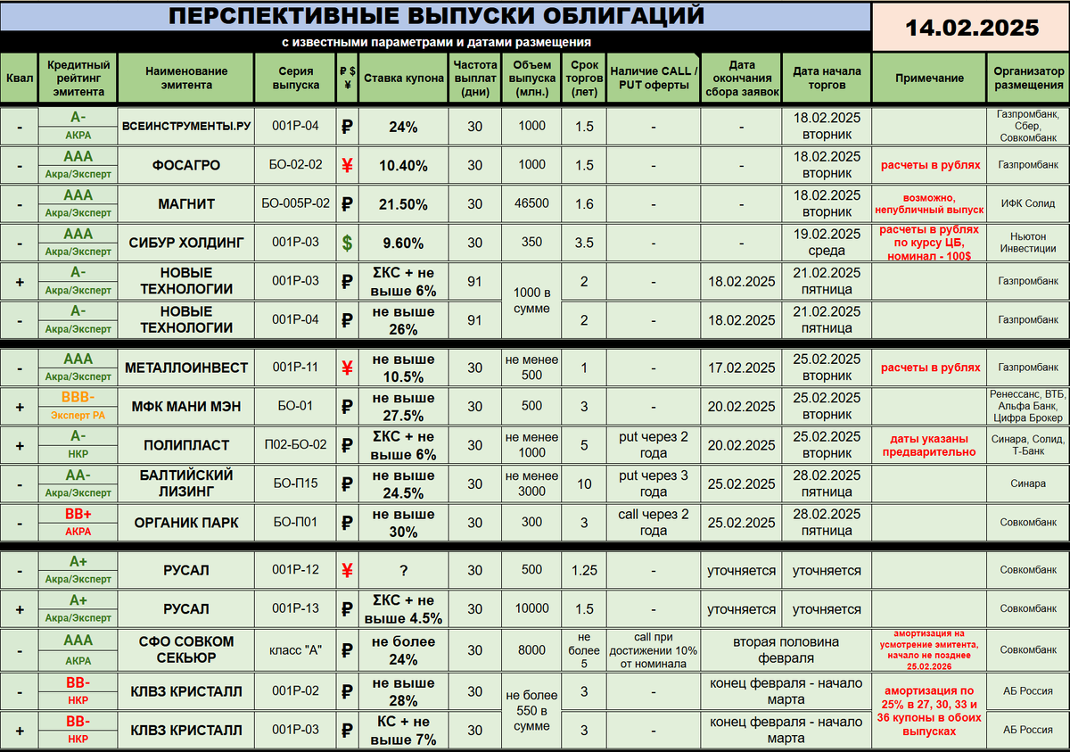 😉 Добрый вечер, друзья! Заседание ЦБ пережили, ставка осталась неизменной, а значит, можно начинать бояться следующего, которое состоится 21 марта. На самом деле откровенного негатива не заметил, но стоит учитываться, что среднесрочный прогноз ключевой ставки на весь 2025 год замер в диапазоне 19-22%, что позволяет двигать любимое значение в любом из направлений. Однако замечу, что прогноз не учитывает всякие телефонные звонки, но тут уж зависит от качества связи :) Такая длинная прелюдия вышла, но всё же к новостям! ---------- 🆕 НОВЫЕ РАЗМЕЩЕНИЯ / АНОНСЫ: ❄️ Финализированы даты размещения долгожданного выпуска БО-П15 эмитента БАЛТИЙСКИЙ ЛИЗИНГ (🅰️🅰️➖). Интересуется им рынок ввиду достаточно длинного срока до оферты - три года. Полный срок обращения бумаг - 10 лет. Напомню, что объем от 3 миллиардов рублей, купон ежемесячный, ориентир ставки - не выше 24,5%. Сбор заявок пройдет 25 февраля (в этот день и узнаем финальный купон), начало торгов - 28 февраля. Организатор - Банк Си