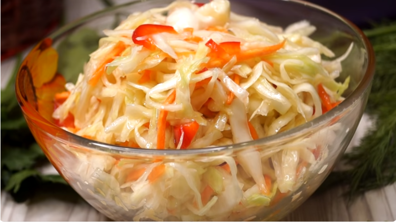 Соль – 1,5ч.л. СПОСОБ ПРИГОТОВЛЕНИЯ Капусту нашинкуем тонкой соломкой, кладем в глубокую миску, добавляем сахар, соль, слегка помнем немного руками, чтобы капуста дала сок и стала помягче. Морковь натрем на терке для корейской моркови, сладкий болгарский перец нарежем соломкой и добавим к капусте, хорошо перемешаем. Добавим измельченный зубчик чеснока (он придаст пикантность вкусу), воду, растительное масло, 9% уксус. Еще раз хорошо перемешиваем. На капусту кладем подходящую по размеру тарелку и сверху ставим груз, оставляем на 3 часа, а лучше на 5-6 часов в прохладном месте. По желанию морковь можно не добавлять, но болгарский перец обя