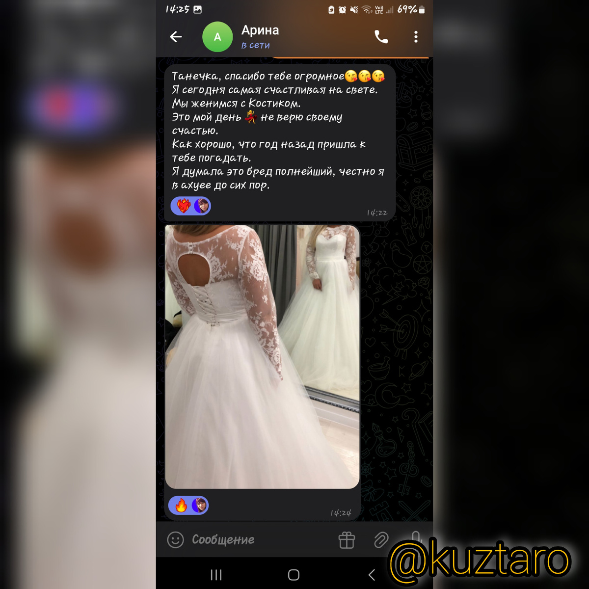 💘 Друзья, сегодня я получила замечательный отзыв от Арины🔥 Хочу поделиться её историей. Ровно год назад, 14 февраля, в День всех влюбленных, она пришла ко мне на консультацию. Грустные глаза, потухший взгляд. Фразы: я никогда не найду свою любовь, всех хороших мужчин разобрали котятами😭 Мы делали расклад на причины одиночества, выясняли блоки, которые тормозят развитие в любовной сфере, смотрели перспективы поиска избранника. Карты показывали интересную картину: 1. Колесо Фортуны - намек на скорые перемены; 2. Рыцарь Кубков - романтичный незнакомец на горизонте; 3. Солнце - обещание счастья и успеха. Я посоветовала Арине быть открытой новым знакомствам и не бояться проявлять инициативу, обозначила места, где обитает её будущий бойфренд. Твоя любовь уже в пути - сказала ей тогда. И вот сегодня я получила это классное сообщение, что она выходит замуж! 💍👰 Оказывается, через месяц после нашей встречи Арина познакомилась с Константином на курсах иностранного языка. Ры