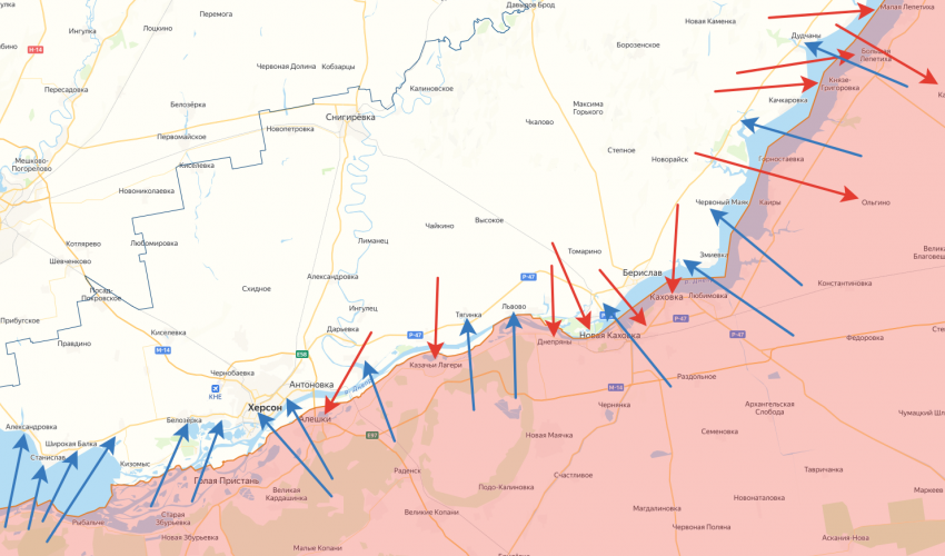 На правом берегу Днепра за прошедшие сутки под огнём и авиаударами оказались Херсон, Станислав, Белозёрка, Александровка, Широкая Балка, Томина Балка, Софиевка, Разлив, Никольское, Понятовка, Берислав, Новоалександровка, Дудчаны, Новая Каменка, Новобе