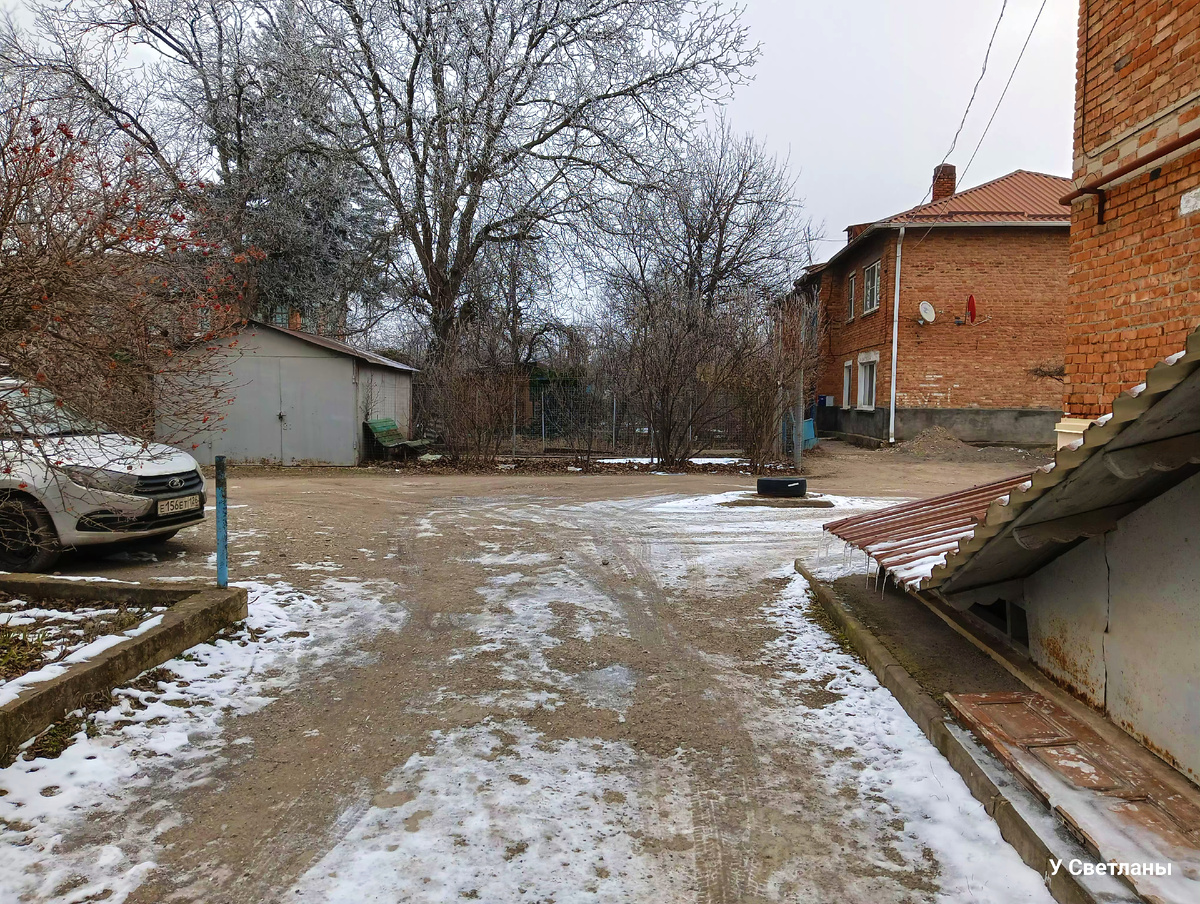 Утро. Мороз. Двор пуст. Небо пасмурное, хмурое. На деревьях не шелохнётся ни один сучок, а значит безветренно и это радует. Расположение наших домов. Дом, в котором я живу - слева, справа расположены огороды. Дом, который расположен прямо - соседский, в нём живут мои подружки. Наш двор самый лучший, самый дружный. Ветки свисают под тяжестью ледяного инея. Смотришь на этот узор и завораживает его красота, словно ажурные хрусталики. Все деревья в станице окутаны мелким хрустальным инеем. На одном из деревьев уже, как два месяца висят сдувшиеся шары, кем-то отправленные в небо в Новый Год и, зацепившись о ветки, так и остались на дереве. Вдали виднеется туман, значит будет тепло. Пока мы с Димой находимся не далеко от церкви - мы решили посетить её и заодно показать вам. Эта церковь построена недавно. Величественные хоромы, большие купола, при ней находятся маленькие постройки, среди них - кухня. Вход. На дверях надпись - храм открыт. Я подумала, а почему храм, а не церковь? Мне обьясни