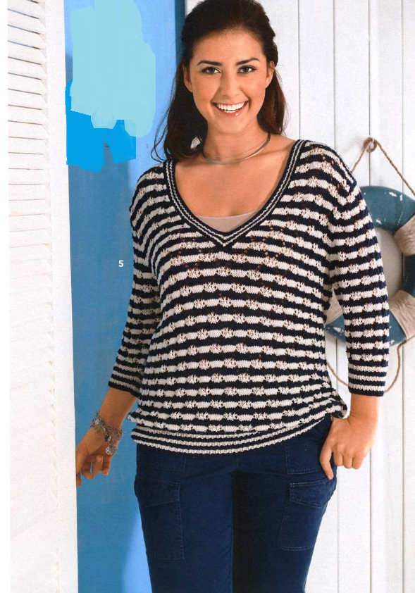Ажурные ромбы и цветные полоски образуют необычный узор этого пуловера. Смотрится замечательно, вяжется легко, узор несложный. И, кстати, такой узор, несмотря на горизонтальное расположение, очень хорошо отвлекает внимание от проблемных зон. V-образный вырез пуловера выделяется за счет полос узора и стройнит фигуру. Цвета можно подобрать и более яркие, пуловер только выиграет от этого.